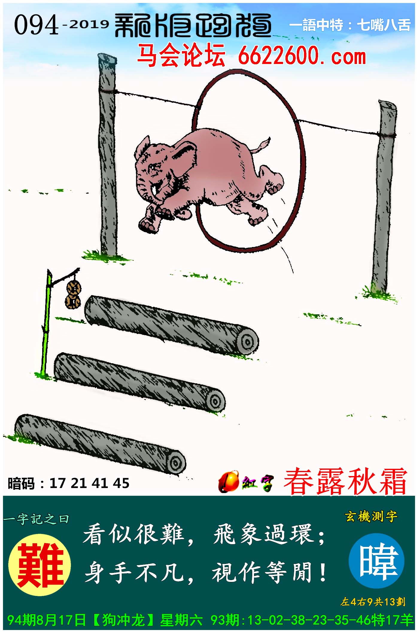 主题 : 094期:新版跑狗一字記之曰【難】玄機測字:《暐》