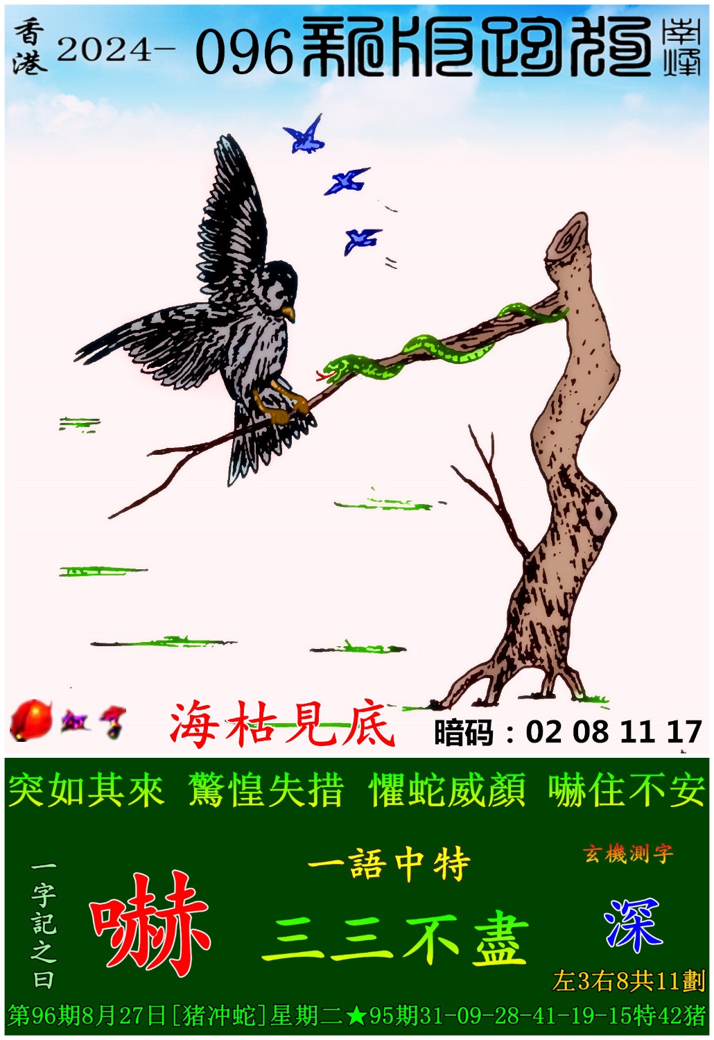 096期:新版跑狗一字記之曰【嚇】 玄機測字:【深】