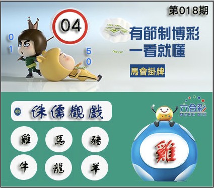 018期正版彩图挂:04 爆:鸡 挂牌成语:侏儒观戏 挂牌出肖:鸡马猪牛龙羊