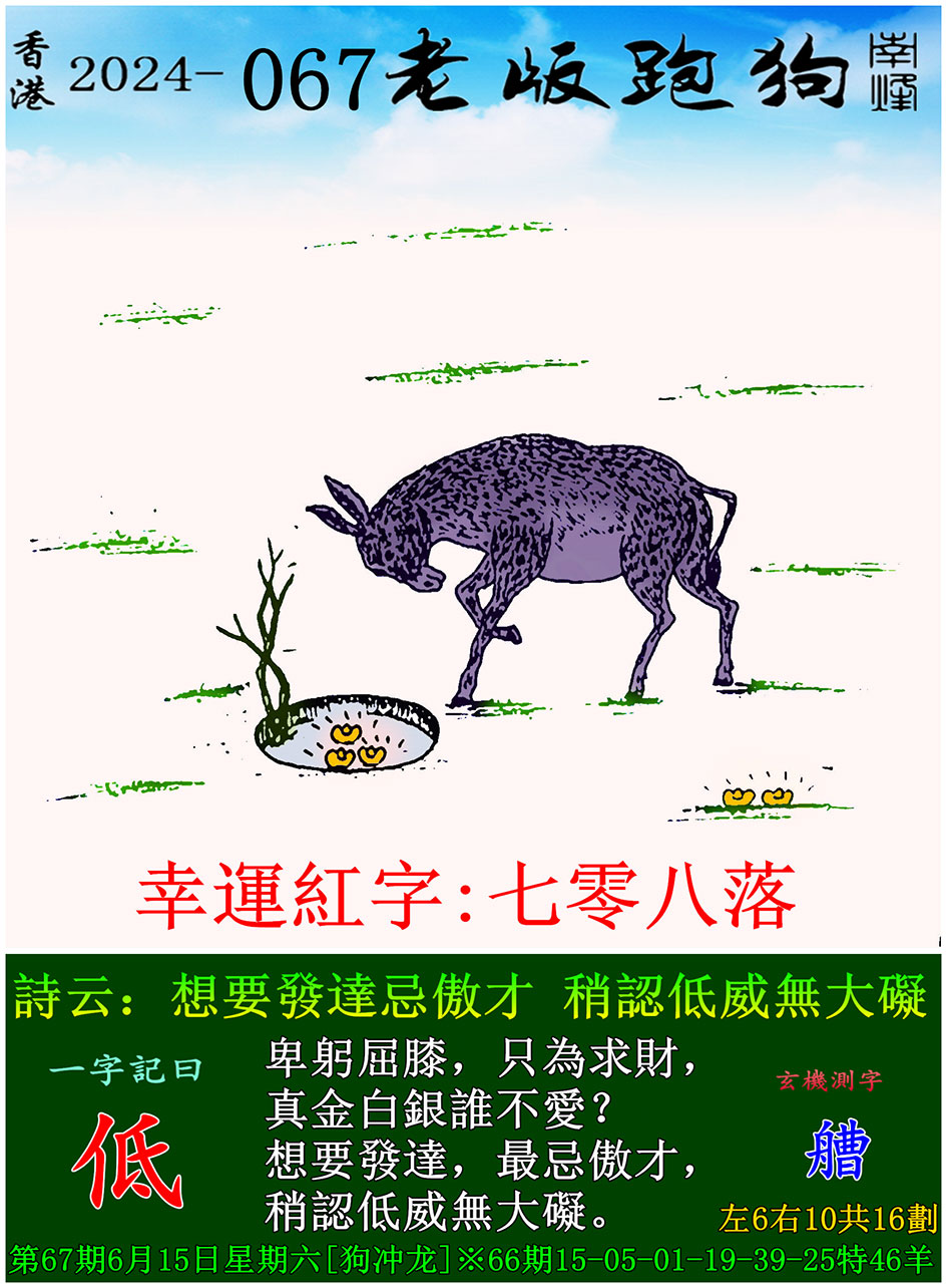 067期老版跑狗一字記之曰:【低】 玄機測字:《艚》