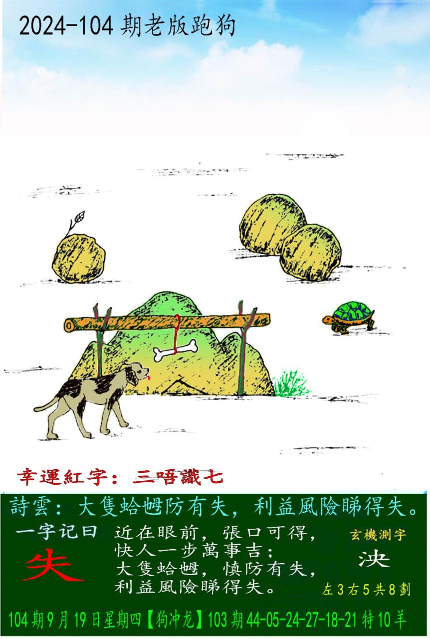 104期老版跑狗一字記之曰:【失】 玄機測字:《泱》