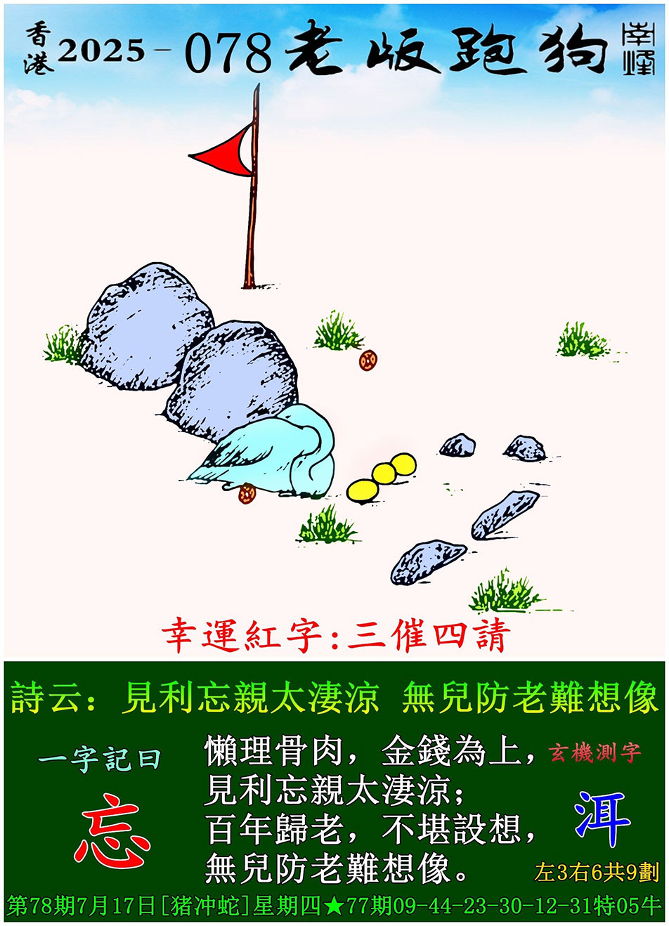 078期老版跑狗一字記之曰:【忘】 玄機測字:《洱》