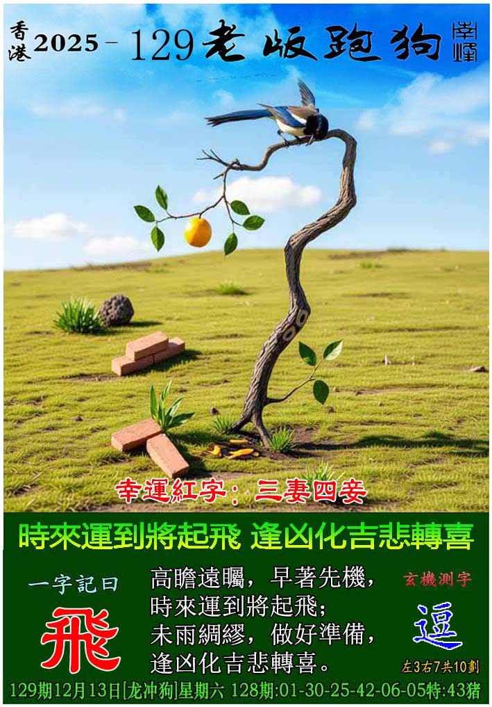 129期老版跑狗一字記之曰:【飛】 玄機測字:《逗》