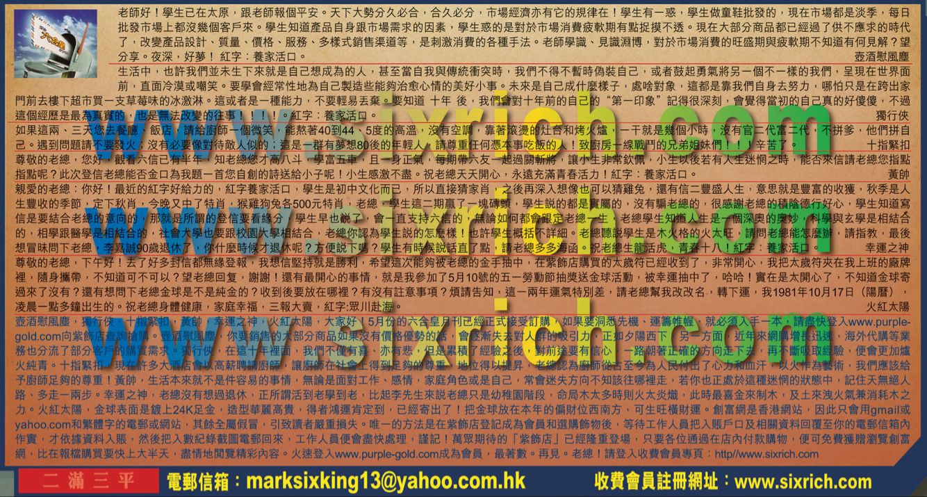 【4】尊敬的老總,您好觀看六信已有半年,知老總您才高八斗 ,學富五車,且一身正氣,每期帶六友一起過關斬將, 讓小生非常欽佩,小生以後若有人生迷惘之時,能否來信請 老總您指點指點呢?此次登信老總能否金口為我題一首您自創的詩送給小子呢!小生感激不盡。祝老總天天開心,永遠充滿青春活力!紅字:養家活口。 ---黄帥