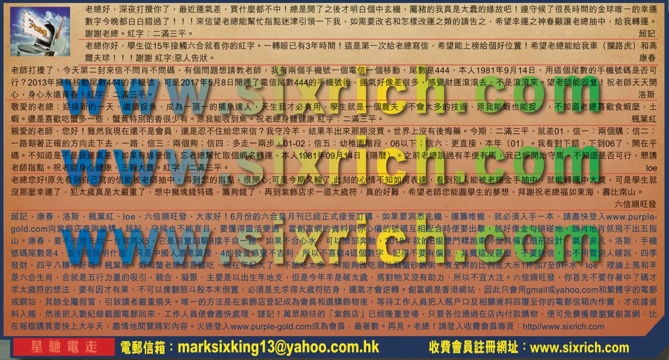 【5】親愛的老師,您好!雖然我現在還不是會員,還是忍不住給您來信?我守冷羊,結果羊出來那期沒買。世界上沒有後悔藥。今期:二滿三平,就差01,信一:兩個購:信二:一路朝著正確的方向走下去,一路,信三:兩個夠;信四:多走一兩步,01-02,信五:幼稚園階段,06以下,信六:更直接,本年(01) 。我看對下錯,下到06了,開在平碼。不知道是不是我運氣差?如果有緣登信忘老總幫忙取個網名轉運,本人1981年09月14日(陽曆)。之前老總說過有羊便有馬,我已經開始守馬,不知道是否可行,懇請老師指點。祝老師身心健康,三報大賣。紅字:二滿三平。 ---loe