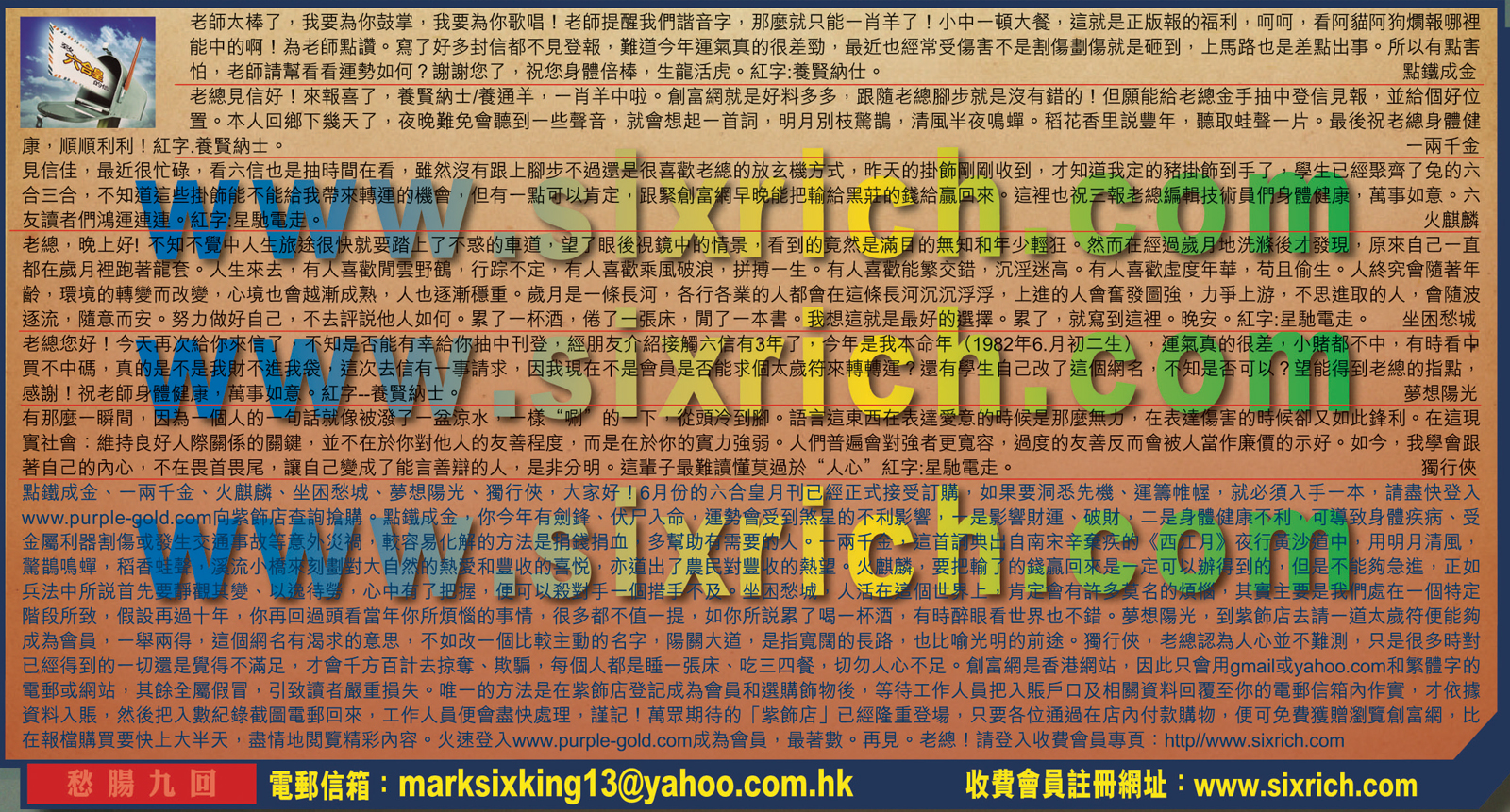 【5】老總您好!今天再次給你來信了,不知是否能有幸给你抽中刊登,經朋友 介紹接觸六信有3年了,今年是我本命年 (1982年6.月初二生),運氣真的很差,小睹都不中,有時看中買不中碼,真的是不是我財不進我袋,這次去信有一事請求,因我現在不是會員是否能求個太歲符來轉轉運?還有學生自己改了這個網名,不知是否可以?望能得到老總的指點,感謝!祝老師身體健康,萬事如意。紅字--養賢纳士。 ---夢想陽光