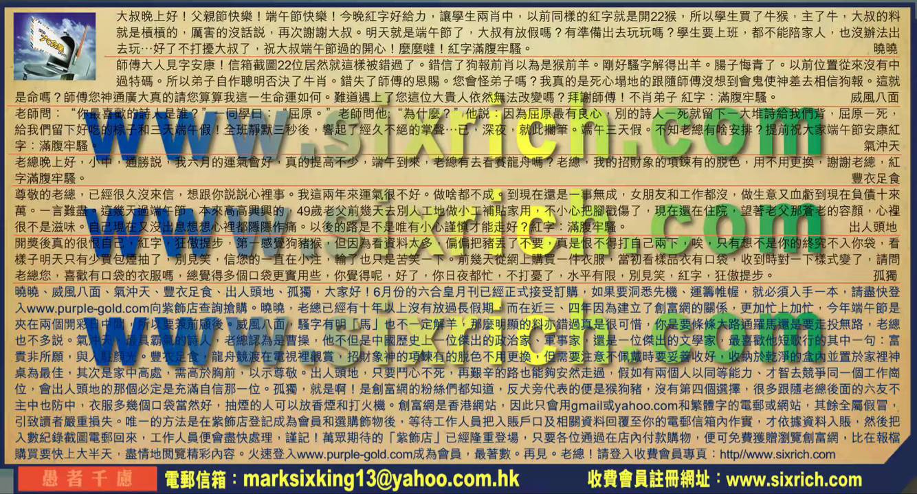 【1】大叔晚上好!父親節快樂!端午節快樂!今晚紅字好給力,讓學生兩肖中,以前同樣的紅字就是開22猴,所以學生買了牛猴,主了牛,大叔的料就是槓槓的,厲害的沒話說,再次謝謝大叔。明天就是端午節了,大叔有放假嗎?有準備出去玩玩嗎?學生要上班,都不能陪家人,也沒辦法出去玩…好了不打擾大叔了,祝大叔端午節過的開心!麼麼噠!紅字滿腹牢騷。 ---曉曉