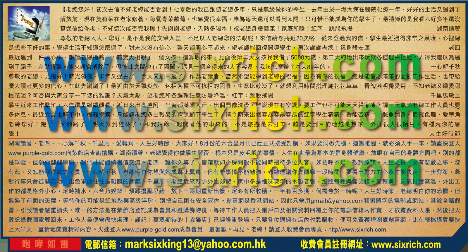【2】老總晚上好,不知道我的信還可以登上末班車嗎?最近這三期真的給力,感謝老總感謝管理員,有你們在,我們做學生的,不怕前方的路有多難走,有老總們的明燈指引,足矣,呵呵,真的是很開心,願老總千歲,長生不老!紅字:一歲三遷 ---豐衣足食