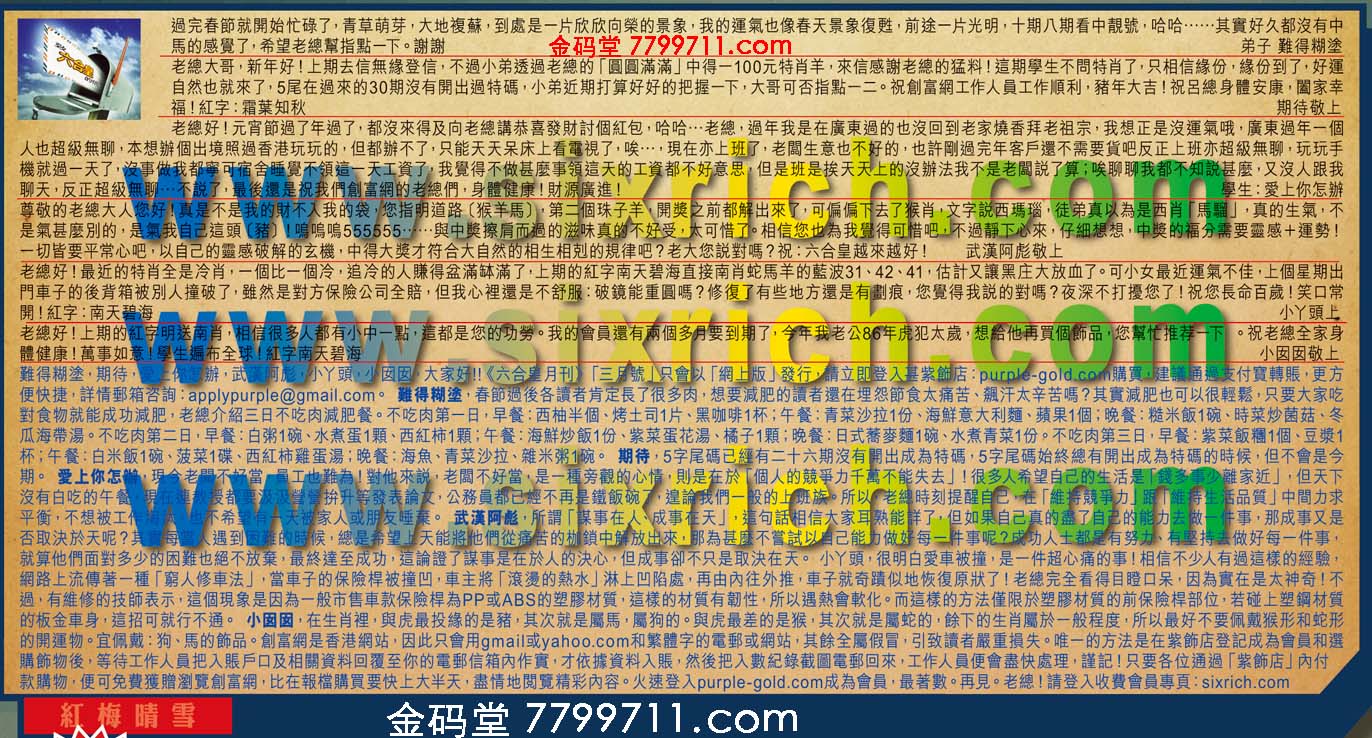 【2】老總大哥,新年好!上期去信無缘登信,不過小弟透摘老總的「圓圓满滿」中得一100元特肖羊,來信感謝老總的猛料!這期學生不問特肖了,只相信緣份,缘份到了好運自然也就來了,5尾在過來的30期沒有開出過特碼,小弟近期打算好好的把握一下,大哥可否指點一二。祝創富網工作人員工作順利,豬年大吉!祝呂總身體安康.闔家幸福!红字:霜葉知秋 ---期待敬上
