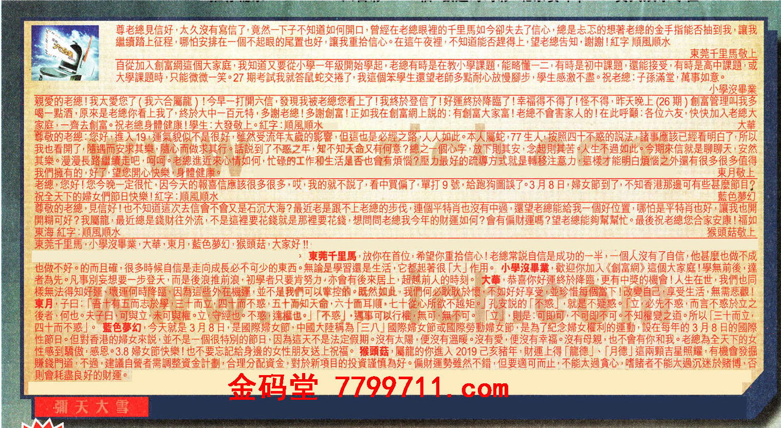 【5】老總,您好!您今晚一定很忙,因今天的報喜信應該很多很多哎,我的就不說了,看中買偏了,單打9號,給跑狗圖誤了。3月8日,婦女節到了,不知香港那邊可有些甚麼節目?祝全天下的婦女們節日快樂!紅字:順風順水 ---藍色夢幻