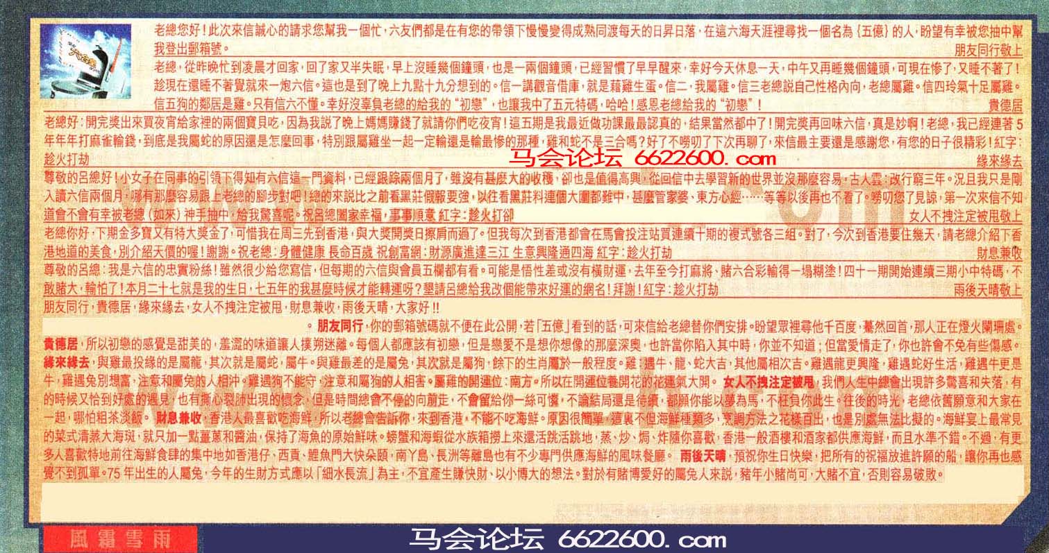 【6】尊敬的呂總:我是六信的忠實粉絲!雖然很少給您寫信,但每期的六信與會員五欄都有看。可能是悟性差或沒有橫財運,去年至今打麻將.賭六合彩輸得一塌糊塗 !四十一期開始連續三期小中特碼:不敢睹大,输怕了!本月二十七就是我的生日.七五年的我甚麼時候才能轉運呀?塑請呂總給我改個能帶來好運的網名!拜謝!紅字:趁火打劫 ---雨後天晴敬上
