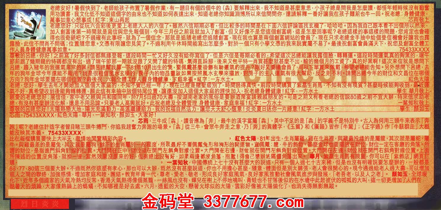 【3】尊敬的呂總,你好!之前寫了好多封信都無缘登報;這段時間一忙又好久没有给你寫信了,但是六信是每期必看的,希望這次呂總能讓我露個臉,轉轉運。這段時間運氣真的夠黑的,端午節前跟了幾期龍的特碼都沒有出,過了端午節那一期就沒跟了又開了龍的特碼,氣得直跺腳,後來又包平特一肖買甚麼就甚麼不出,輪的幾個月的工資了,真的好黑啊!這次来信就是想問下呂總,踏入猪年的我重复非常的黑,請呂總幫我算一下81年10月出生的我,要佩戴甚麼褂飾有助重筑的提升?刚好又要續會員了,可以下單買來佩戴,希望老總能告知。另外想間下呂總,去年的狗年金球今年還能不能用?我是很相信風水玄學的,房子內的物品擺放如果按照風水玄學來擺放對房子的主人運氣有很大幫助,反之則不利。請問呂總今年的財位和文昌位在哪個方向?狗年金球要擺在哪個位置?最後祝:六報全體工作人员身體健康,家庭幸福。红字:一方水土。 ---紅色太陽