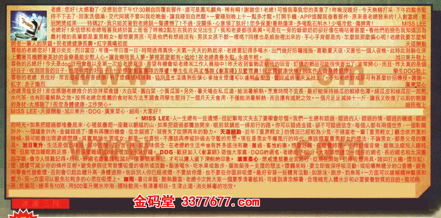 【1】老總:您好!太感動了,沒想到您下午17:30親自回覆我郵件,這可是鳳毛麟角,稀有啊!謝謝您!老總!可惜我辜負您的美意了!昨晚沒睡好,今天無精打采,下午四點多堅持不下去了,回家洗個澡,交代阿姨不要叫我吃晚飯,讓我睡到自然醒。一覺睡到晚上十一點多才醒。打開手機,APP提醒我查看郵件,原來是老總發來的!入創富網,到開獎結果...特碼27,我只能笑著對老總說一聲遺憾了 !不過,沒關保,心意領了就好!您多保重!署熱傷津,多喝點石斛水!少喝冷飲,傷脾胃! ---MISS LEE