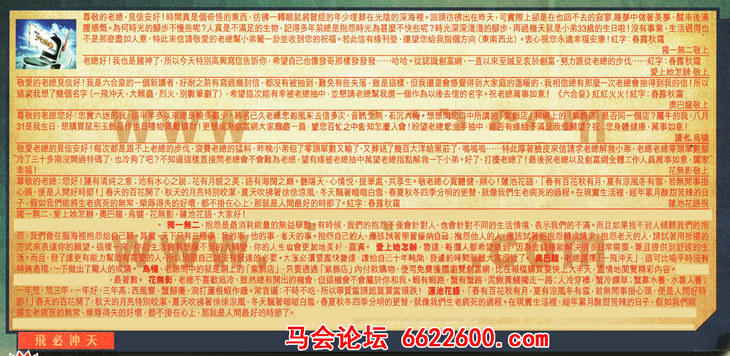 【3】.敬愛的老總見信好!我是六合皇的一個新讀者,好耐之前有寫過幾封信,都沒有被抽到,難免有些失落,雖是這樣,但我還是會感覺得到大家庭的溫暖的,我相信總有那麼一次老總會抽得到我的信!所以這次我想了幾個名字(一飛沖天,大賴蟲,烈火,別數筆劃了),希望這次能有幸被老總抽中,並懇請老總幫我選一個作為以後去信的名字。祝老總萬事如意! 《六合皇》紅紅火火!紅字:春露秋霜    奧巴龍敬上