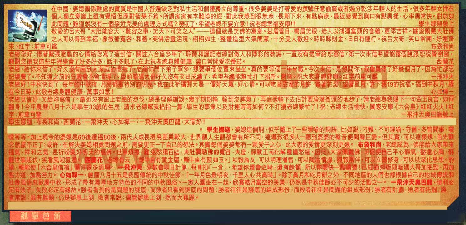 【6】.老總見信好,又給妳寫信了。最近沒有跟上老總的步伐,總是理解錯誤。幾乎期期輸,輸到沒脾氣了,再這樣輸下去估計要淪落街頭的地步了,請老總為我賜下一句金玉良言,如何翻身!今年農曆八月十六是學生33歲的生辰,請求老總幫我掐指一算,學生的事業以及財運等等如何?不打擾老總繁忙了!祝:老總生活愉快,闔家安康《六合皇》紅紅火火!紅字:前車可鑒    一飛沖天奧巴龍敬上