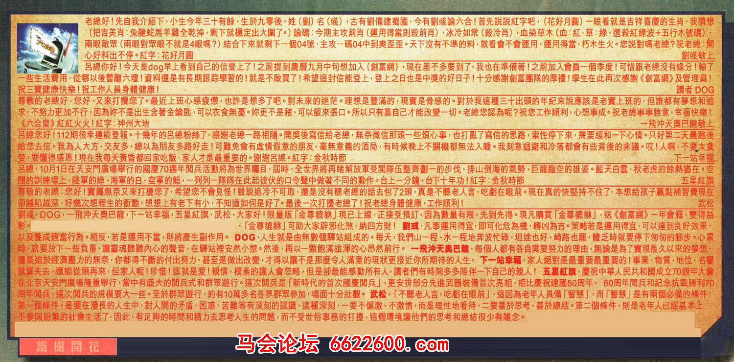 【4】.呂總您好!112期很幸運能登報。十幾年的呂總粉絲了,感謝老總一路相隨。開獎後寫信給老總,無奈微信那頭一些煩心事,也打亂了寫信的思路,索性停下來,需要緩和一下心情。只好第二天晨跑後給您去信。我為人大方,交友多,總以為朋友多路好走!可難免會有虛情假意的朋友,毫無意義的酒局,有時候晚上不關機都無法入睡。我刻意迴避和冷落都會有些背後的非議。哎!人啊,不要太貪婪,要懂得感恩!現在我每天黃昏都回家吃飯,家人才是最重要的。謝謝呂總。紅字:金秋時節    下一站幸福