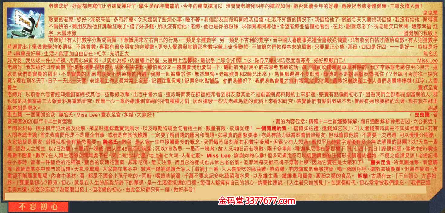 【6】.老總好,以前看六信曾經知道創富網被其他一些報紙攻擊,出言中傷六信,這段時間我在群裡經常看到群友發其他不是創富網資料報紙上來群裡,感覺有點偏離初心了,因為我們全部都是創富網的人,群也都是以創富網三大報資料為重點研究,理應一心一意的維護創富網的所有種種才對,居然還發一些與老總為敵的資料上來看和研究,感覺他們有點對老總不忠,曾經有過想腿群的念頭,現在我在群里基本都是潛水。    糾結