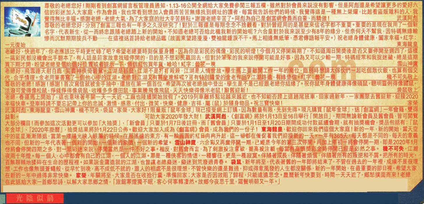 【2】尊敬的老總您好:分別了創富三報也有一年多之久沒研究了!對於三報還是每期念念不捨觀看,對於曾經用的是甚麼來信名字都不重要。重要的是現在我用了一個新名字,代表新生,從一而終忠跟隨老總踏上新的開始。不知道老總可否給此機我新的開始呢?六合皇對於我來說至少有8年的緣分,但奈何天不幫我,因特碼無緣輸惨而沉默期期按兵不,...在這裡送首詩給老總品鎰(故園東望路漫漫,雙袖龍鍾淚不干。馬上相逢無紙筆,憑君傳語報平安o)祝老總身體健康,闔家幸福。紅字:一元復始-----東海龍皇