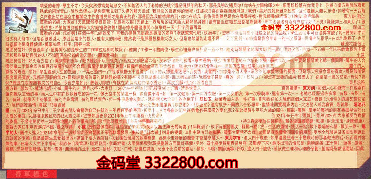 【5】.老總見信好,好久沒去信了。算來有四五年了吧?雖説不玩六很久了,但從沒忘記過六信,沒忘記老總的教導。學生愚钝,很少悟透過老總在六信的玄機。學生今次來信主要是想請教老總一個問題,属牛的人合適從事二手黃金回收這個行業嗎?如若不合適,煩請老總指點下迷津。這幾年無論做甚麼事情都是一敗塗地。望老總金手抽中,视闔家安康!紅字:歲月無恙  属牛的人