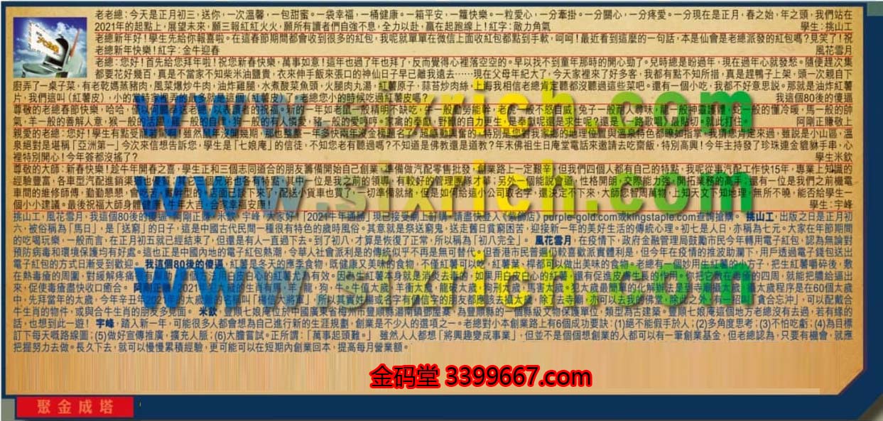 【1】.老老總:今天是正月初三,送你,一次溫馨,一包甜蜜。一袋幸福,一桶健康。一箱平安,一籮快樂。一粒愛心,一分牽掛。一分關心,一分疼爱。一分現在是正月,春之始,年之頭,我們站在2021年的起點上,展望未來,願三報紅紅火火,願所有讀者們自強不息,全力以赴,赢在起跑線上!紅字:敵力角氣 學生:挑山工