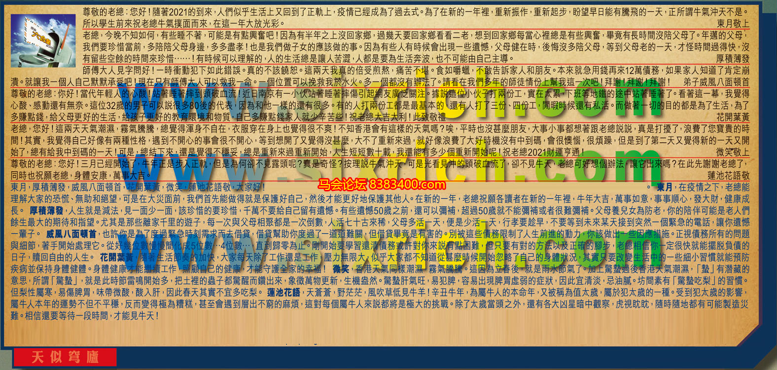 【5】.老總,您好!這兩天天氣潮濕,霧氣騰騰,總覺得渾身不自在,衣服穿在身上也覺得很不爽!不知香港會有這樣的天氣嗎?唉,平時也沒甚麼朋友,大事小事都想著跟老總說說,真是打擾了,浪費了您寶貴的時間!其實,我覺得自己好像有兩種性格,遇到不開心的事會很不開心,等到想開了又覺得沒甚麼,大不了重新來過,就好像浪費了大好時機沒有中到碼,會很懊惱,很煩躁,但是到了第二天又覺得新的一天又開始了,總有給我中到碼的一天!可是,總結下來,還是覺得不穩妥,總是重新來過重新開始,大生短短數十載,我還能有多少個重新開始呢!祝老總2021財運亨通! 微笑敬上