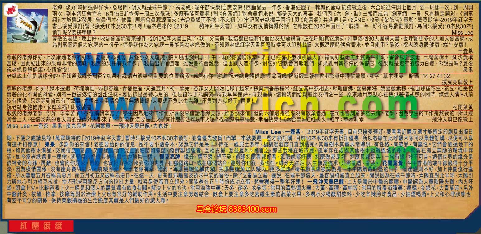 【1】.老總,您好!時間過得好快,眨眼間,明天就是端午節了。祝老總:端午節快樂!合家安康!回顧過去一年多,香港經歷了一輪輪的嚴峻抗疫戰之後,六合彩從停開七個月;到一周開一次;到一周開兩次;到本週馬會宣布:6月15日起恢復一周三次攪珠!多麼難能可貴啊!對《創富網》對會員們來說,都是天大的喜事!我們因《六、創、貼》三報而成為「創富網」一員,只有穩定開彩,《創富網》才能穩定發展!會員們才有依靠!願新會員源源而來;老會員鍥而不捨!不忘初心,牢記與老總攜手同行!與《創富網》共進退!另,6月9日,收到《紫飾店》電郵:萬眾期待~2019年紅字天書已接受預訂(暫只接受10本及30本)!嗯!這本遲來的《2019——豬年紅字天書》,如果沒有疫情搗亂的話,它應該在2020年面世了!耽擱一年,好不容易啟動預訂,為何只接受(10本及30本)預訂呢?要拼單嗎? Miss Lee