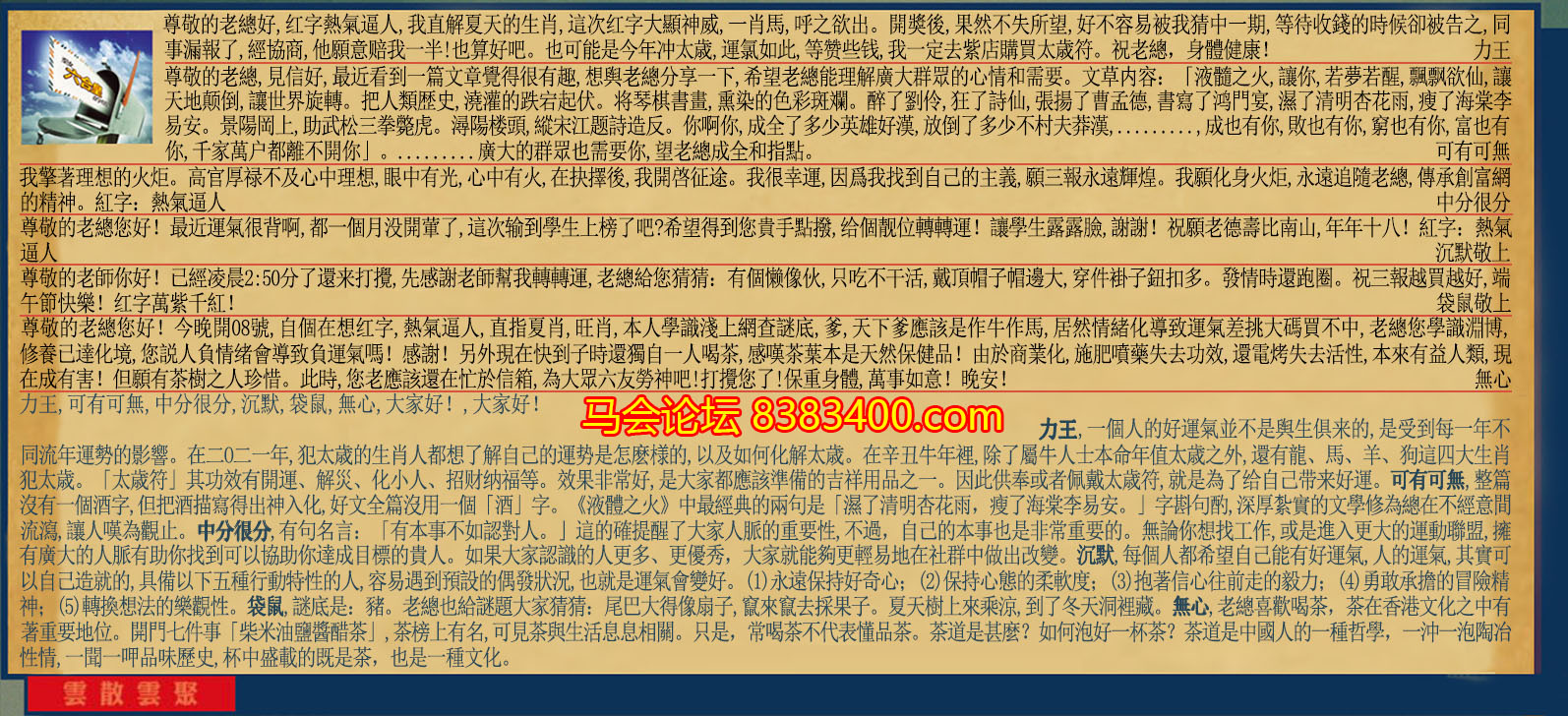 【1】尊敬的老總好,红字熱氣逼人,我直解夏天的生肖,這次紅字大顯神威,一肖馬,呼之欲出。開後,果然不失所望,好不容易被我猜中一期,等待收錢的時候卻被告之,同事漏報了,经協商,他願意赔我一半!也算好吧。也可能是今年冲太歳,運氯如此,等赞些钱,我一定去紫店購買太歳符。祝老總,身醒健康!力王