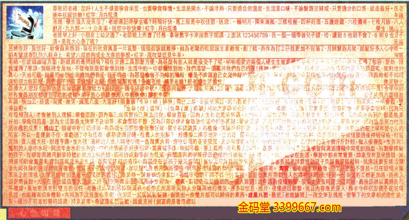 【2】.老總:學生很久沒來信了,老總還記得學生嗎?時間好快,馬上就是中秋佳節,送您:一輪明月,兩束清風,三棵桂樹,四杯好酒,五盞燈籠,六柱彌香,七枚月餅,八人對月,九九歸一,十分美滿。祝您中秋快樂!紅字:月白風清  學生:挑山工