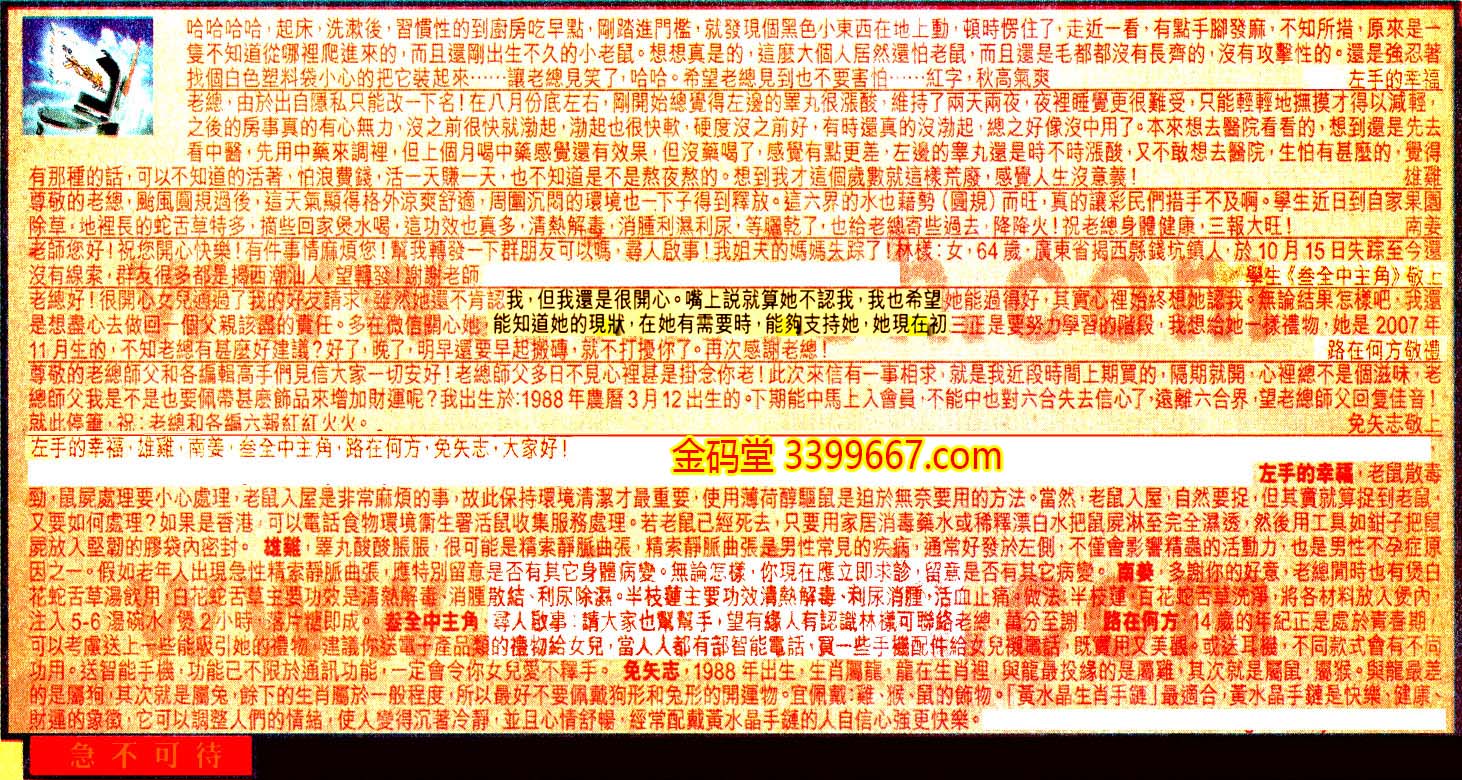 【6】.尊敬的老總師父和各編輯高手們見信大家一切安好!老總師父多日不見心裡甚是掛念你老!此次來信有一事相求,就是我近段時間上期買的,隔期就開,心裡總不是個滋味,老總師父我是不是也要佩帶甚麼飾品來增加財運呢?我出生於:1988年農曆3月12出生的。下期能中馬上入會員,不能中也對六合失去信心了,遠離六合界,望老總師父回复佳音!就此停筆,祝:老總和各編六報紅紅火火。 免矢志敬上