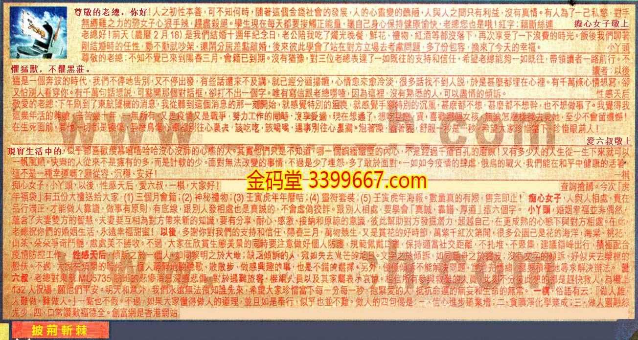 【3】.尊敬的老總:不知不覺已来到陽春三月,會籍已到期。沒有猶豫,對三位老總表達了一如既往的支持和信任,希望老總能夠一如既往,帶領讀者一路前行。不懼猛獸,不懼黑莊。 讀者:以後