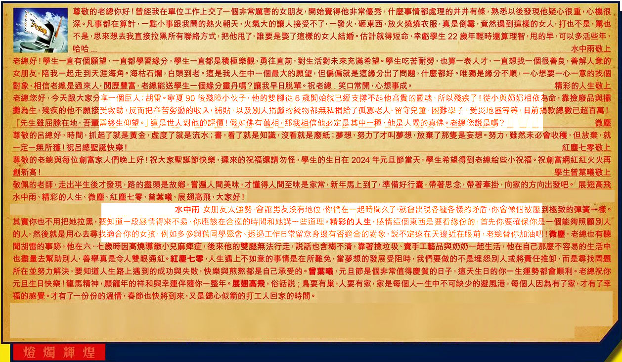 【5】.尊敬的老總與每位創富家人們晚上好!祝大家聖誕節快樂,遲來的祝福還請勿怪,學生的生日在 2024 年元且節當天,學生希望得到老總給些小祝福。祝創富網紅紅火火再創新高! 學生曾葉曦敬上