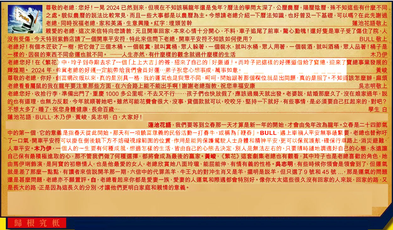【1】.尊敬的老總:您好!一晃 2024 已然到來,但現在不知該稱龍年還是兔年?曆法的學問太深了,公曆農曆,陽曆陰曆,殊不知這些有什麼不同之處。貌似農曆的說法比較常見,而且一些大事都是以農曆為主。今想請老總介紹一下曆法知識,也好普及一下基礎,可以嗎?在此先謝過老總,同時祝福老總,家和美滿,生意興隆。紅字:埋頭苦幹 蓮池花語敬上