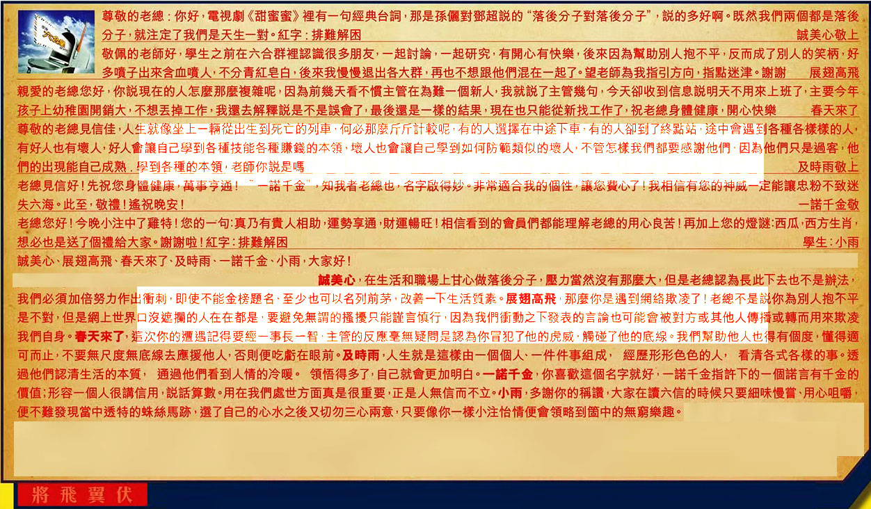 【2】.敬佩的老師好,學生之前在六合群裡認識很多朋友,一起討論,一起研究,有開心有快樂,後來因為幫助別人抱不平,反而成了別人的笑柄,好多喷子出來含血喷人,不分青紅皂白,後來我慢慢退出各大群,再也不想跟他們混在一起了。望老師為我指引方向,指點迷津。謝謝  展翅高飛