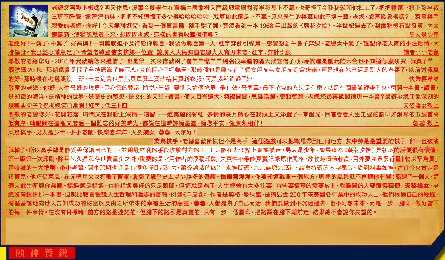 【1】.老總您喜歡下棋嗎?明天休息,沒事今晚學生在單機中國象棋入門級與電腦對弈半夜都下不赢,也奇怪了今晚我就和他扛上了。把把輸還下棋下到半夜三更不睡覺,還津津有味。把把不知道悔了多少棋哈哈哈哈哈,就算如此還是下不赢。原來學生的棋藝如此不堪一擊,老總,您喜歡象棋嗎?  菜鳥棋手