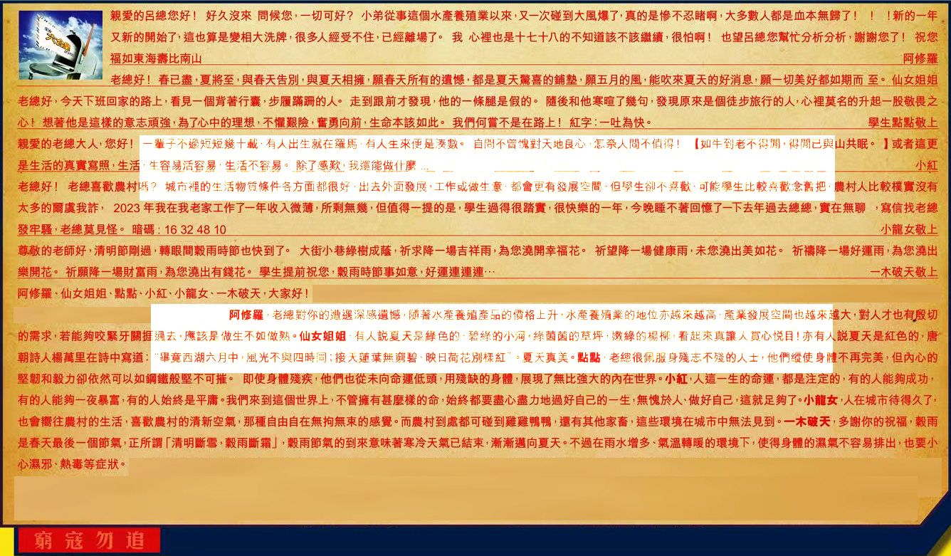 【5】.老總好!老總喜歡農村嗎?城市裡的生活物質條件各方面都很好,出去外面發展,工作或做生意,都會更有發展空間,但學生卻不喜歡,可能學生比較喜歡念舊把,農村人比較樸實沒有太多的爾虞我詐,2023 年我在我老家工作了一年收入微薄,所剩無幾,但值得一提的是,學生過得很踏實很快樂的一年,今晚睡不著回憶了一下去年過去總總,實在無聊, 寫信找老總發牢騷,老總莫見怪。暗碼: 16 32 48 10 小龍女敬上