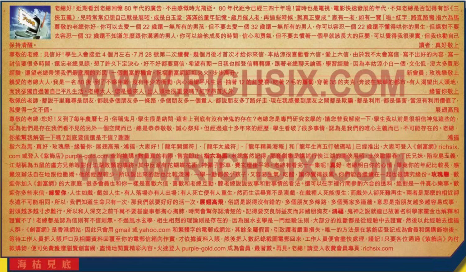 →〖玫瑰戀〗:歡迎你加入《創富網》的大家庭,很多會員也和你一樣是喜歡六信、喜歡和老總互動,聽老總說說故事和對事情的看法。還可以在字裡行間參酌六合的透料,絕對是一件賞心樂事。歡迎你多些來信。