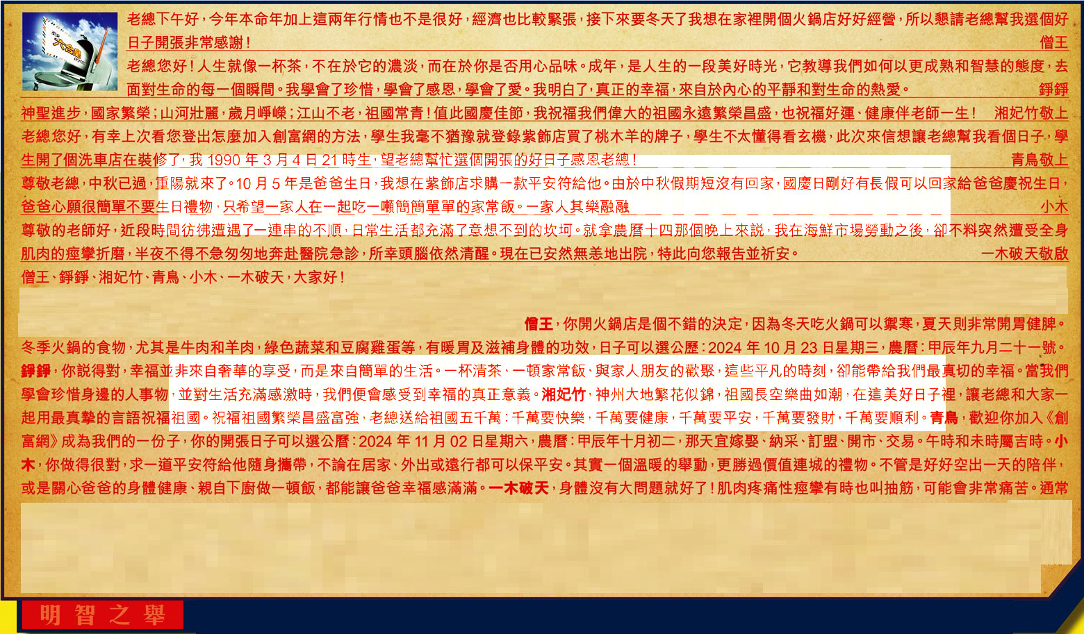 【1】.老總下午好,今年本命年加上這兩年行情也不是很好,經濟也比較緊張,接下來要冬天了我想在家裡開個火鍋店好好經營,所以懇請老總幫我選個好日子開張非常感謝! 僧王