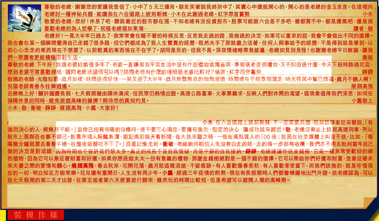 【2】.敬愛的老總,您好!休息了吧,聽說最近的股市都在漲,不知老總有沒投資股市。股票可能跟六合差不多吧,雖都買不中,都是運氣吧,還是很喜歡老總的為人哲學了,祝福老總福如東海,讀者, 敬