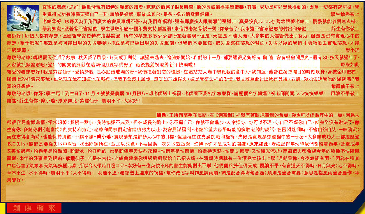 →〖餘生有你〗:多總你對《創富網》的支持和肯定,老總和同事們定會繼續努力以赴,為會員謀福利。老總希望大家平時能夠多聽老總的說話,在困頓迷惘時,不會自怨自艾、一味消沉;而在志得意滿時,也能保持清醒、不驕不躁。