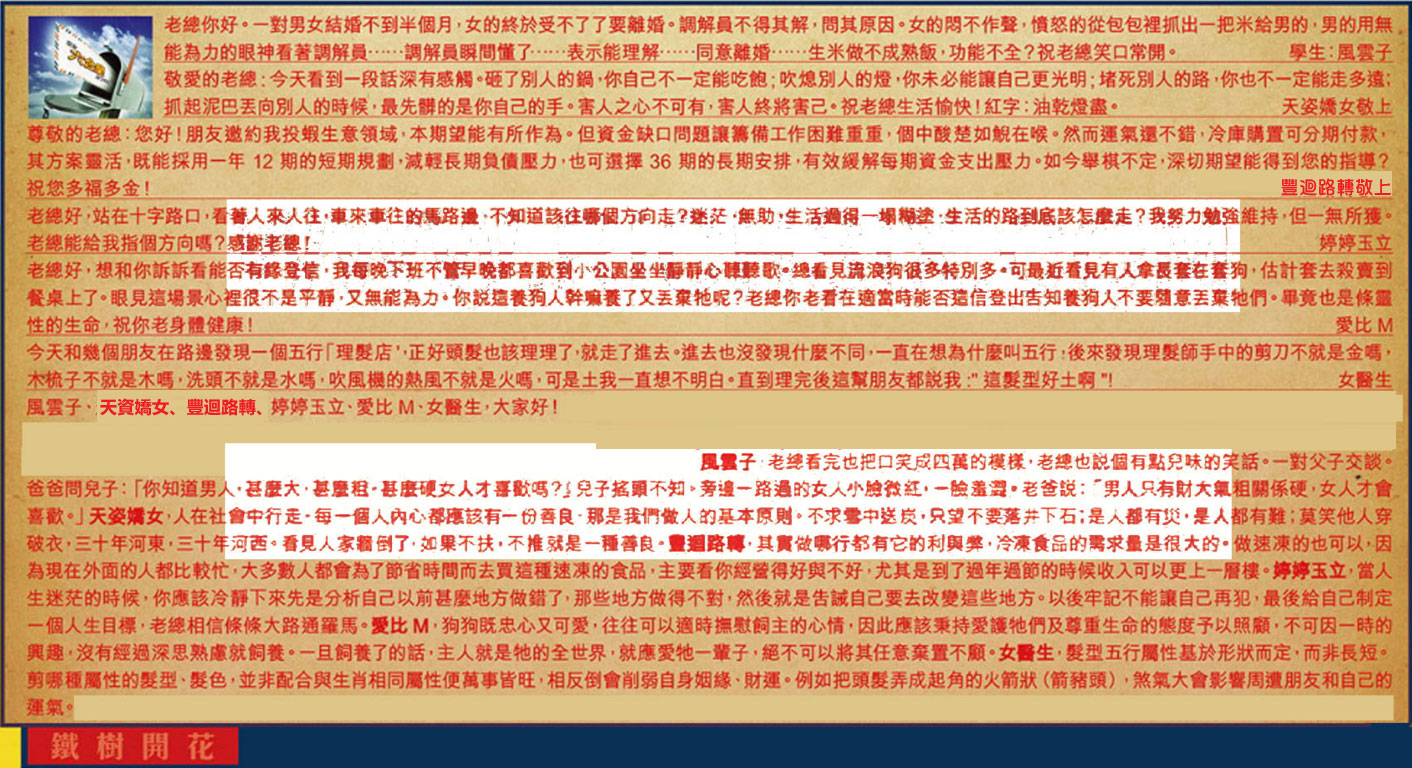 【2】.敬愛的老總:今天看到一段話深有感觸。砸了別人的鍋,你自己不一定能吃飽;吹熄別人的燈,你未必能讓自己更光明堵死別人的路,你也不一定能走多遠;抓起泥巴丟向別人的時候,最先髒的是你自己的手。害人之心不可有,害人終將害己。祝老總生活愉快!紅字:油乾燈盡。 天姿嬌女敬上