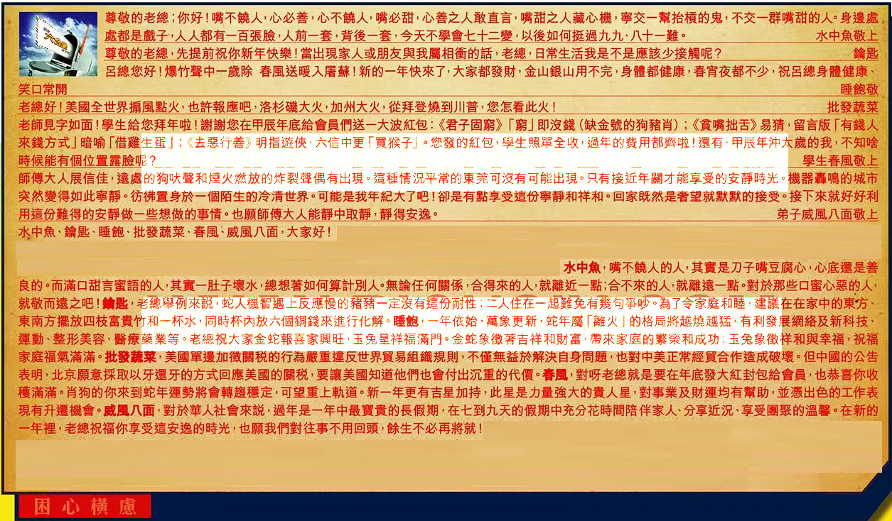 【5】.老師見字如面!學生給您拜年啦!謝謝您在甲辰年底給會員們送一大波紅包:《君子固窮》「窮」即沒錢(缺金號的狗豬肖);《貧嘴拙舌》易猜,留言版「有錢人來錢方式」暗喻「借雞生蛋」《去惡行善》明指遊俠,六信中更「買猴子」。您發的紅包,學生照單全收,過年的費用都齊啦!還有,甲辰年沖太歲的我,不知啥時候能有個位置露臉呢? 學生春風敬上