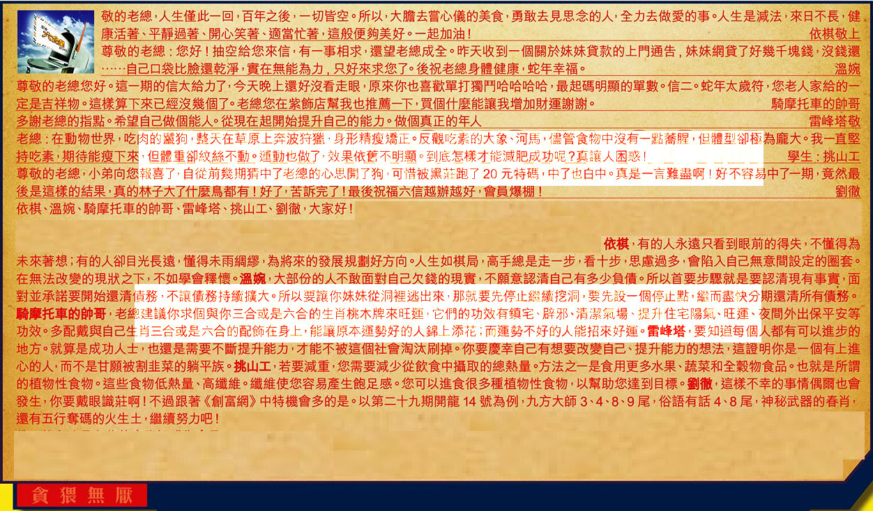 【3】.尊敬的老總您好。這一期的信太給力了,今天晚上還好沒看走眼,原來你也喜歡單打獨鬥哈哈哈哈,最起碼明顯的單數。信二。蛇年太歲符,您老人家給的一定是吉祥物。這樣算下來已經沒幾個了。老總您在紫飾店幫我也推薦一下,買個什麼能讓我增加財運謝謝。 騎摩托車的帥哥
