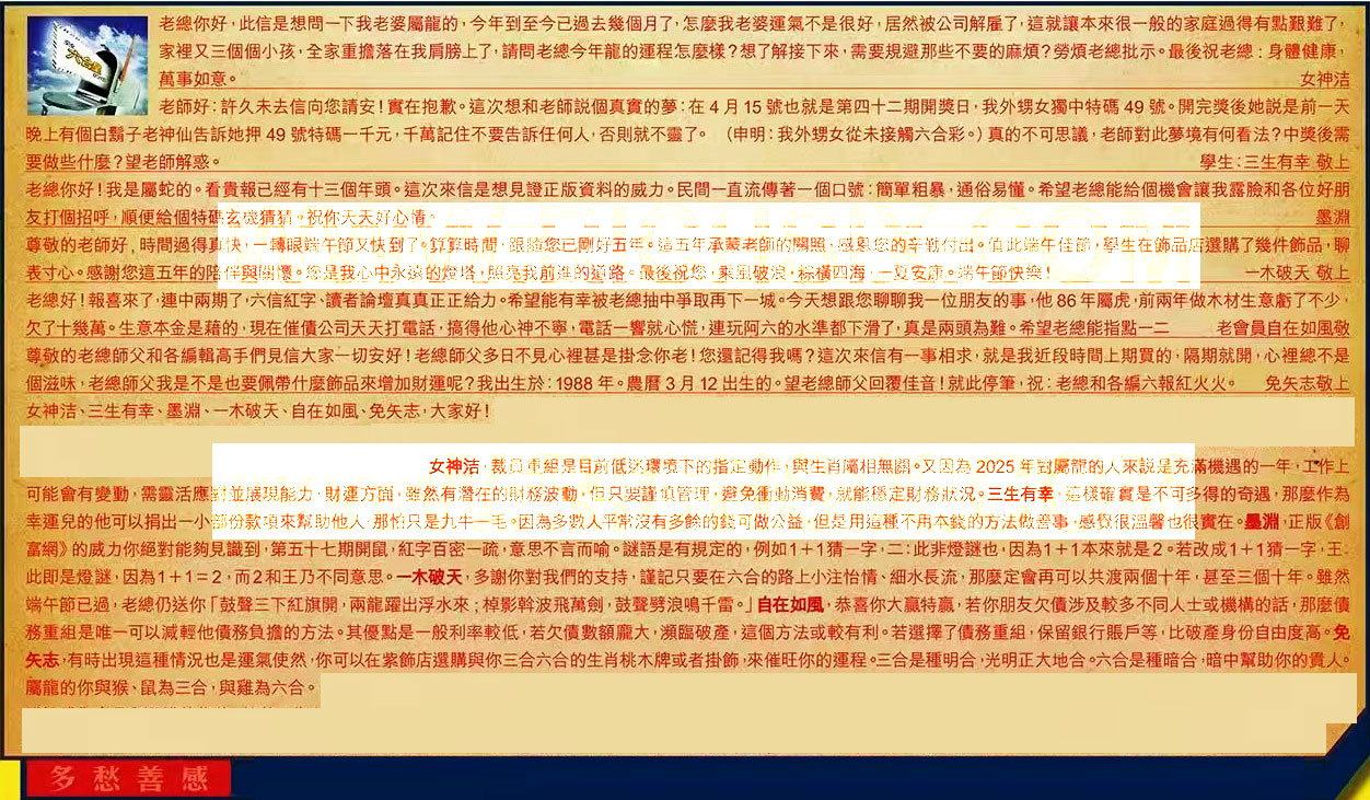 【5】.敬上老總好!報喜來了連中兩期了,六信紅字、讀者論壇真真正正給力。希望能有幸被老總抽中爭取再下一城。今天想跟您聊聊我一位朋友的事 ,他86年屬虎,前兩年做木材生意虧了不少,欠了十幾萬。生意本金是藉的,現在催債公司天天打電話,搞得他心神不寧,電話一響就心慌 ,連玩阿六的水準都下滑了,真是兩頭為難。希望老總能指點一二 老會員自在如風敬