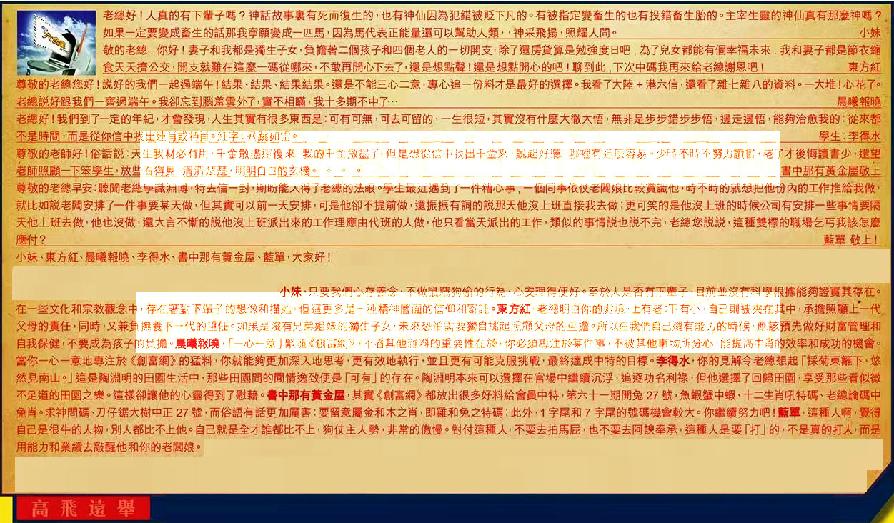 【3】.尊敬的老總您好!說好的我們一起過端午!結果、結果、結果結果。還是不能三心二意,專心追份料才是最好的選擇。我看了大陸+港六信,還看了雜七雜八的資料。一大堆!心花了。老總說好跟我們一齊過端午。我卻忘到腦羞雲外了,實不相瞒我十多期不中了... 晨曦報曉