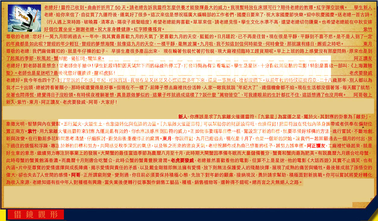 【2】.老總,給你來信了,自從買了九運符後,運氣好了很多。這次來信是想祝福廣大編輯部的工作者們,國慶日要來了,祝大家國慶節快樂。迎中秋慶國慶。送老總一首古詩。(行人遇上來時路,破曉霧,清寒去,隔夜子規聲暗度)希望老總能夠喜歡草草來信,請老總見怪。學生文化水準不高,還望老總切勿嫌棄。也希望老總能在中秋安排好個位置坐坐。謝謝老總。祝大家身體健康。紅字膝癢搔背。 紫竹